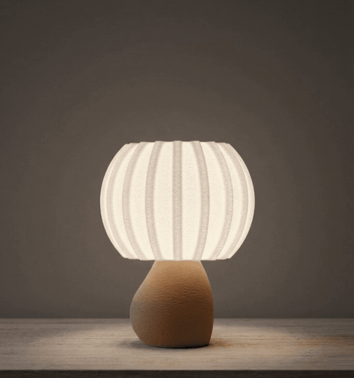 Abajur açıldığı anda, dikey çizgili üst yüzeyden süzülen ışık tasarımın organik kavislerini ve kum beji kaidesini ön plana çıkarır. Ürün farklı açılardan gösterilirken, ışığın çizgisel doku üzerindeki zarif oyunu ve modern formun mekana kattığı seçkin ambiyans her yönden sergilenir.