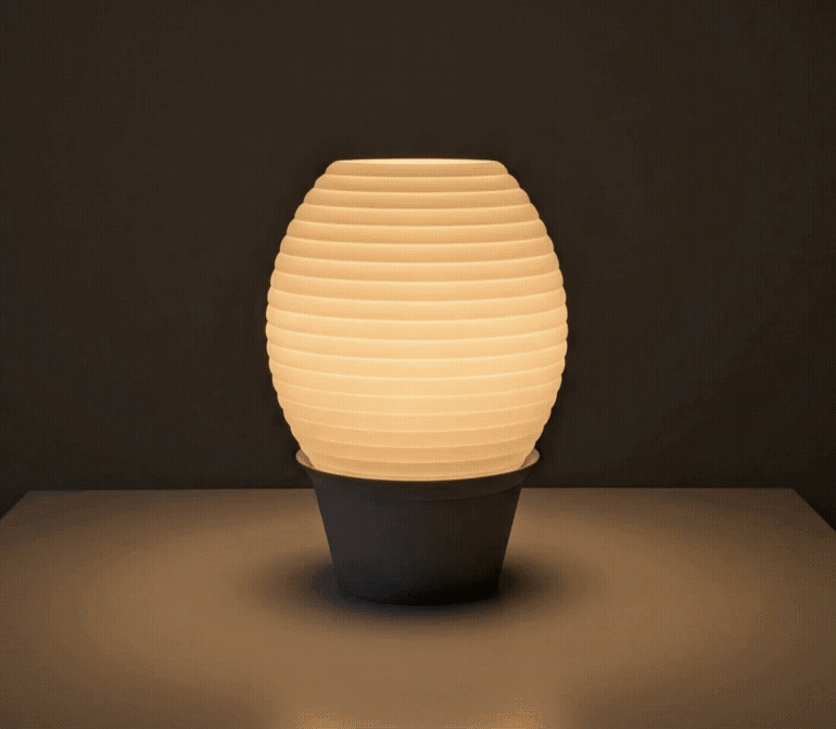 Abajur aktive edildiği anda, yatay çizgili yüzeyden süzülen ışık tasarımın dairesel formunu ve alt kaide ile olan kontrastını netleştirir. Ürün farklı açılardan gösterilirken, ışığın çizgisel doku üzerindeki akışkan hareketi ve minimalist silüetin mekana kattığı seçkin ambiyans her yönden sergilenir.