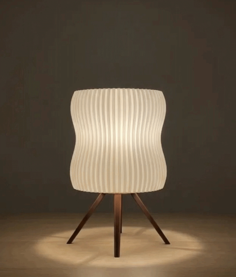 Abajur açıldığı anda, dikey kanalların arasından süzülen ışığın başlık yüzeyinde yarattığı dokusal derinlik net bir şekilde görülür. Tripod ayakların dengeli duruşu eşliğinde ürünün etrafında oluşan yumuşak ışık halesi, tasarımın mekana kattığı modern ve sıcak ambiyansı sergiler.