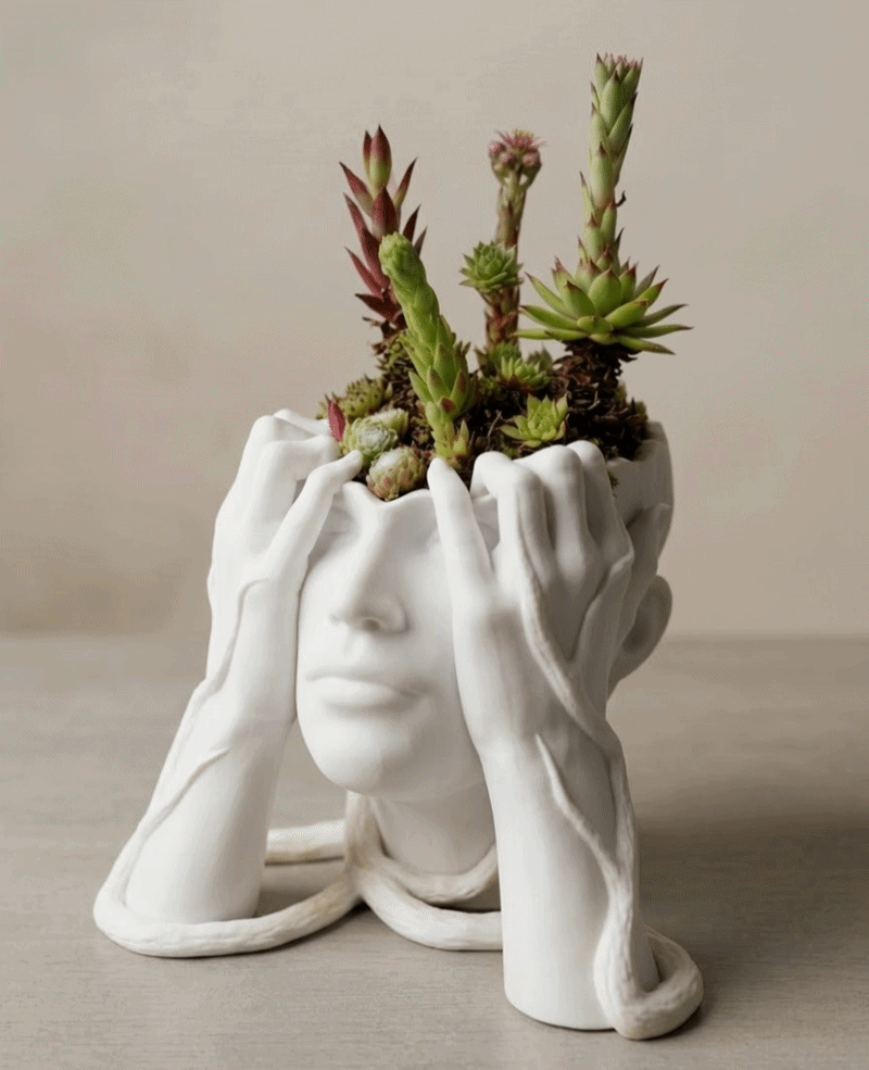 Düşüncelerin doğayla filizlenmesini simgeleyen bu heykelsi saksı, insan formunun dinginliğini yaşam alanlarınıza taşır. Modern tasarımı ve sanatsal derinliğiyle, bitkilerinizi sıradan bir saksıdan çok daha öte, yaşayan bir sanat eseri olarak sergilemenizi sağlar.