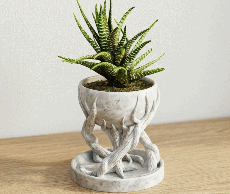 Rooted Serenity, geleneksel saksı formlarını reddeden, adeta bir ağacın köklerinden yükselen organik bir kadehi andıran tasarımıyla öne çıkar. Alttaki dairesel tabladan yükselen ve saksı haznesini şefkatle kavrayan dal formları, bitkilerinizin doğal büyüme döngüsünü vurgulayan bir estetik sergiler. Bu özel parça, salonunuzun en kıymetli köşesinde, ofis masanızda veya minimalist bir rafta konumlandırıldığında mekanın tüm enerjisini bir anda dönüştürür.